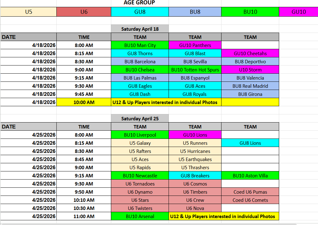 U5 TO U10 Team & Individual photos are scheduled on April 18 and April 25th.